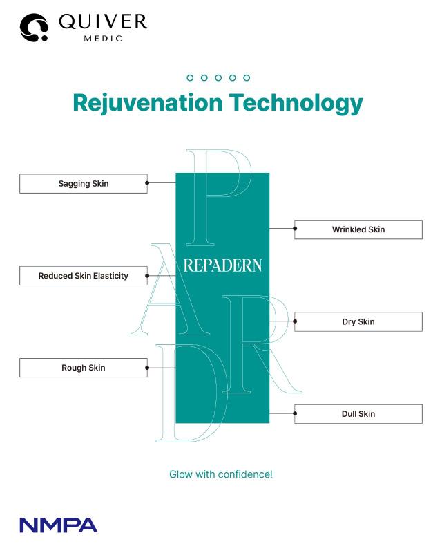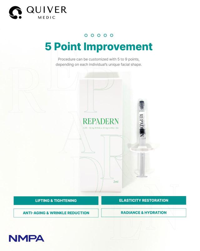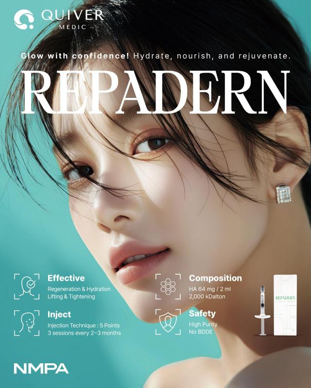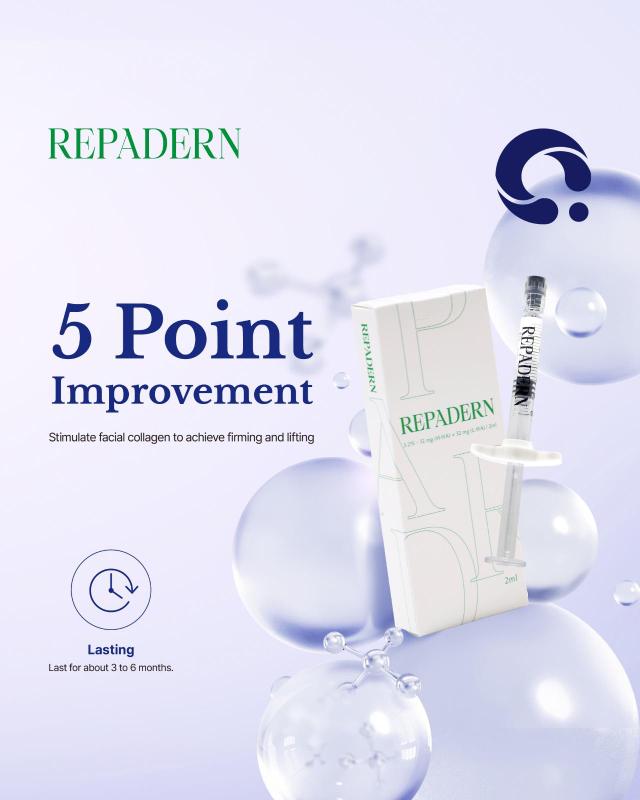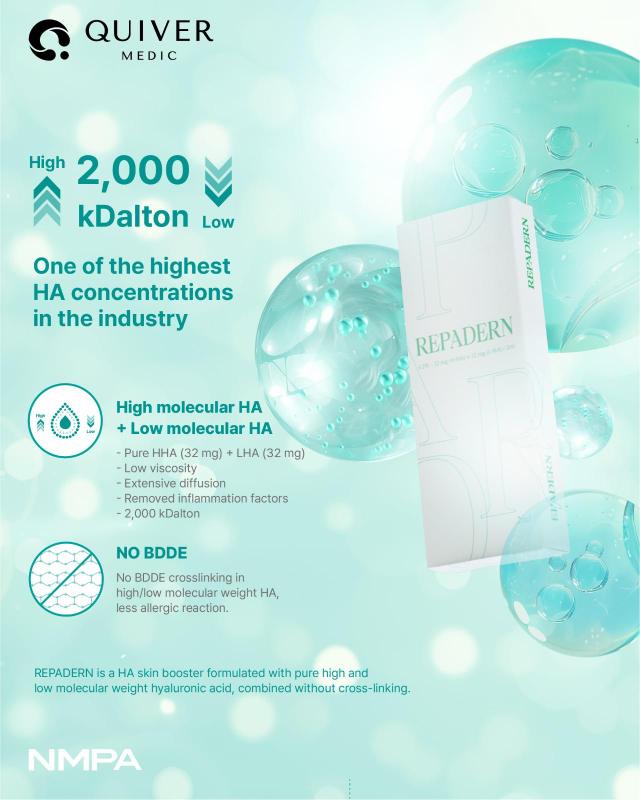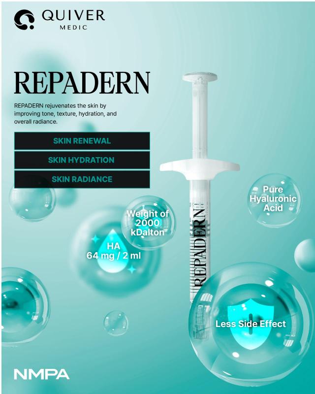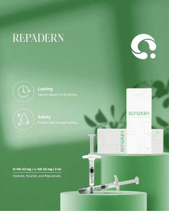 REPADERN; yüksek ve düşük moleküler ağırlıklı hyaluronik asidin çapraz bağlanmadan bir araya getirildiği, ciltte rejenerasyon, hidrasyon ve sıkılaşmayı desteklemeye yönelik geliştirilmiş bir HA skin booster ürünüdür. Toplam 64 mg / 2 ml hyaluronik asit içeriğine sahiptir ve 2.000 kDalton moleküler ağırlık aralığında yapılandırılmıştır.